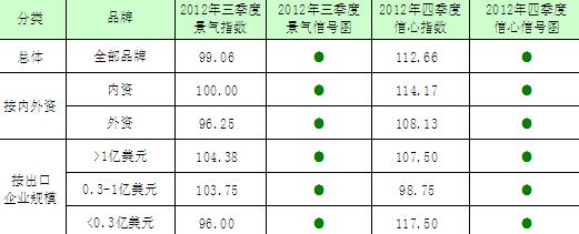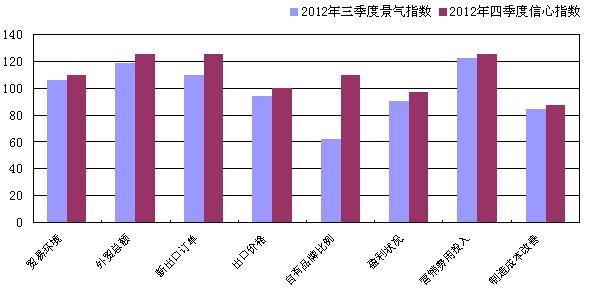 从内外资品牌的表现来看,与2012年二季度相比内资品牌景气指有所增长,为100,增长了不到1个百分点,等于基准值;外资品牌景气指数稍低,为96.25,与上季度相比上升了近9个百分点,略低于基准值。从企业的出口规模来看,年出口额大于1亿美元的一线企业景气指数最高,为104.38,虽高于基准值,但与上季度相比下滑近7个百分点;二线企业(年出口额在0.3亿至1亿美元之间)的景气指数为103.75,位列第二,略高于基准值3.75个百分点;年出口额低于0.3亿美元的三线企业景气指数为96,排名最后。相比于2012年二季度,二线和三线企业景气指数表现上扬,一线企业指数下滑。