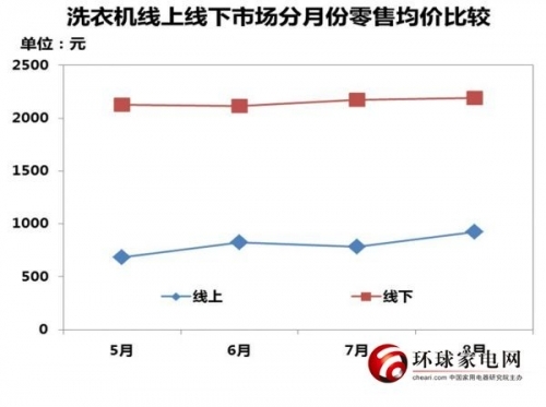 图为洗衣机线上线下市场分月份零售均价比较